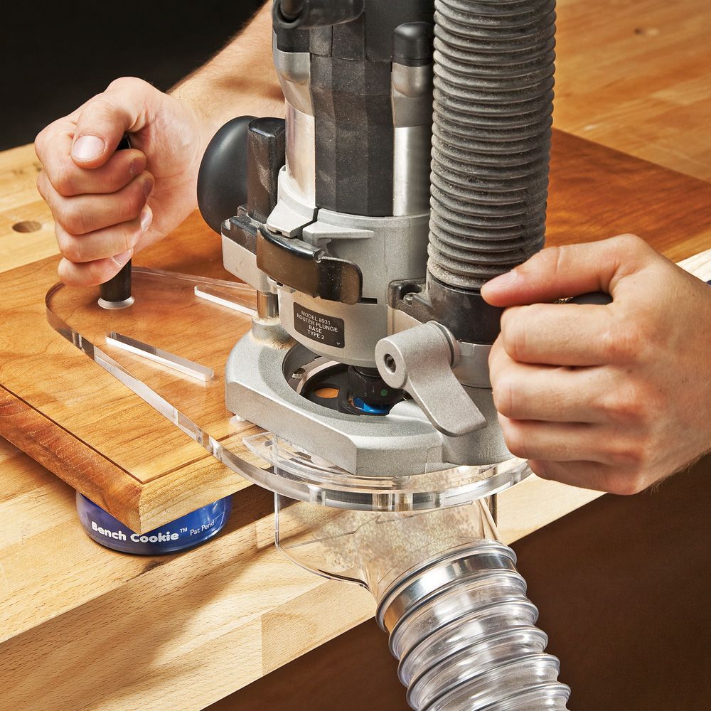 This versatile router baseplate extends well over the flat face of your workpiece, providing far better stability when edge profiling. In addition, it includes a fence/edge guide that can be used to guide bits without bearings along the edge of your workpiece—ideal for dados, grooves, fluting and inlays. The fence is reversible: one edge is straight, while the other is a contoured two-point guide that’s useful for following inside and outside curves. Finally, the baseplate accepts our selection of Standard (4” O.D.) Rockler Router Plate Insert Rings, which add a great deal of versatility to your router. A standard guide bushing insert is included, while a variety of other inserts are available separately.